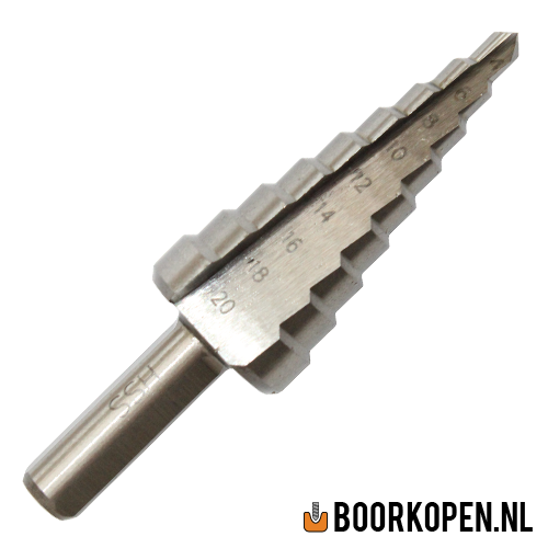 Stappenboor 4-20mm voor gebruik tot 4 mm dik plaatmateriaal uit HSS geslepen staal. Voor het boren in plaatstaal of het opboren van bestaande gaten in stappen. De 9 stappen die gemaakt kunnen worden zijn 4-6-8-10-12-14-16-18-20 mm.
