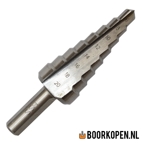 Voor het boren in plaatstaal of het opboren van bestaande gaten in stappen. De 8 stappen die gemaakt kunnen worden zijn 6-8-10-12-14-16-18-20 mm.