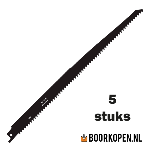 Zaagblad reciprozaag voor hout. De totale lengte van het zaagblad is 300mm. De vertanding is 6TPI (6 tanden per inch), tandlengte 4mm en is geschikt voor hout. Hoe groter het TPI getal is, des te fijner de vertanding. Fijne vertanding gebruikt u als de zaagsnede fijn afgewerkt dient te zijn, een klein TPI getal, dus grove vertanding gebruikt u voor het grove werk. Bij grove vertanding kunt u ook dikker materiaal zagen. Bij hard materiaal kunt u beter een zaag nemen met meer tanden. De prijs is per verpakking van 5 stuks.