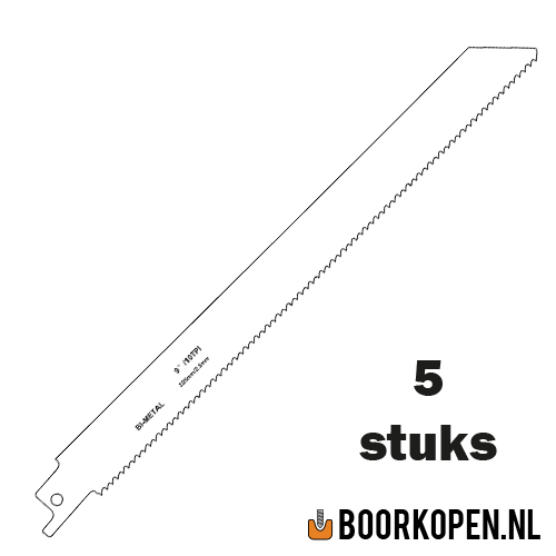 Zaagblad reciprozaag universeel voor hout en metaal. De totale lengte van het zaagblad is 225mm. De vertanding is 10 TPI (10 tanden per inch), tandlengte 2,5mm en is geschikt voor hout en metaal. Hoe groter het TPI getal is, des te fijner de vertanding. Fijne vertanding gebruikt u als de zaagsnede fijn afgewerkt dient te zijn, een klein TPI getal, dus grove vertanding gebruikt u voor het grove werk. Bij grove vertanding kunt u ook dikker materiaal zagen. Bij hard materiaal kunt u beter een zaag nemen met meer tanden. De prijs is per verpakking van 5 stuks.